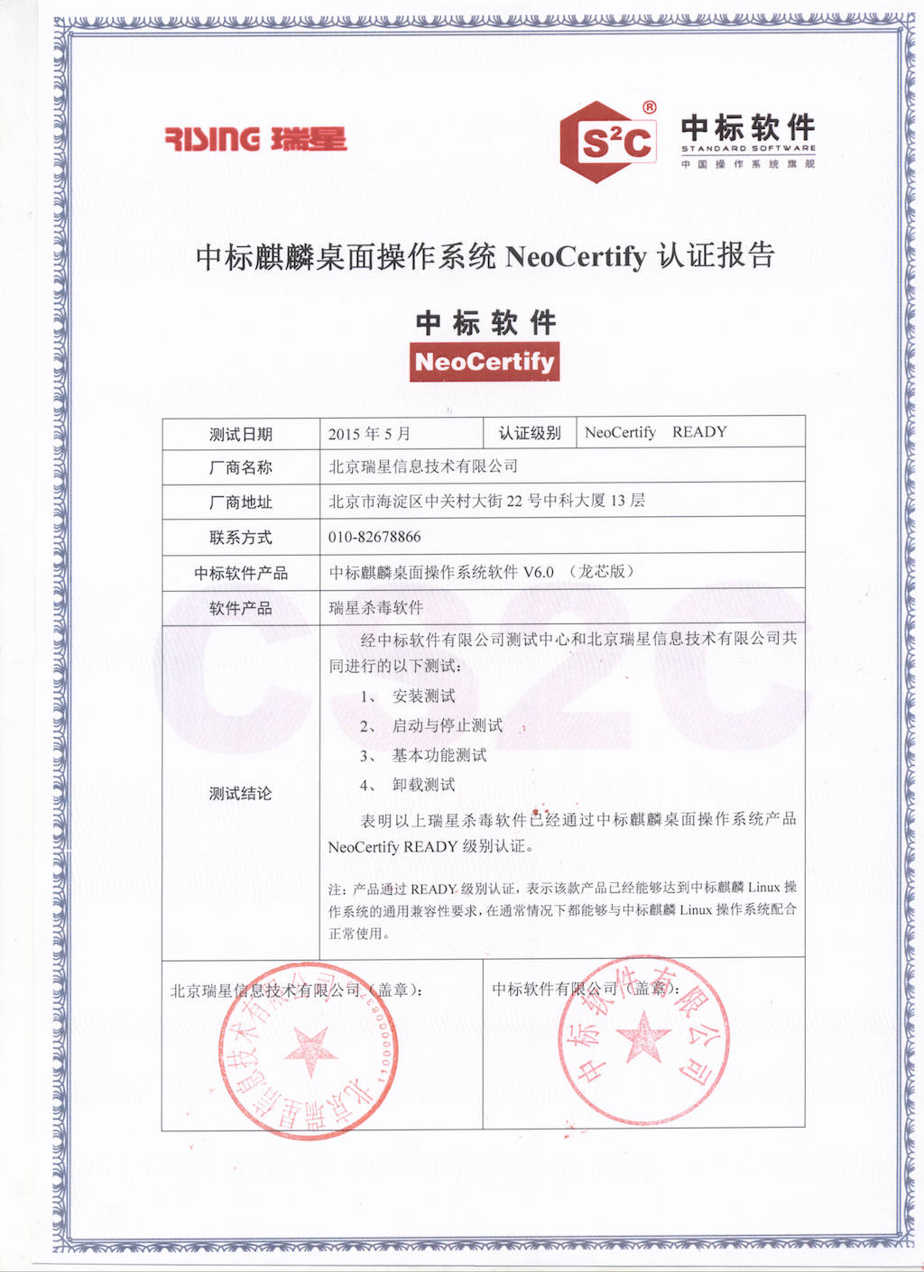 瑞星殺毒軟件 2016-08-26 產品互為認證證明 中標麒麟桌面操作系統 V6.0(X86) 2016-08-26 產品互為認證證明 中標麒麟桌面操作系統 V6.0(龍芯) 2016-01-27 PChome 2015年度防護之星獎 2015-07-29 最佳人氣獎2007 2015-07-29 中小企業市場占有率第一 2008-2009 2015-07-29 優秀軟件人氣獎 2015-07-29 十大影響力品牌獎 2007 2015-07-29 殺軟網友選擇獎 2015-07-29 殺軟多特軟件站編輯推薦獎 2015-07-29 殺軟2007年度推薦產品獎 2015-07-29 殺軟 站長人氣獎 2010 2015-07-29 殺軟 站長人氣獎 2009 1 2 下一頁 尾頁
